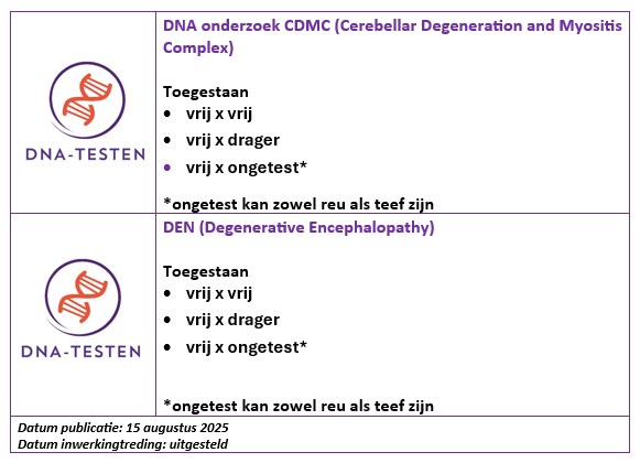 Bovenstaande tekst is opgesteld door de rasvereniging(en). Wij hebben geen inhoudelijke controle gedaan en zijn niet verantwoordelijk voor onjuistheden of onduidelijkheden in de tekst. Heb je vragen, neem dan contact op met de rasvereniging(en).